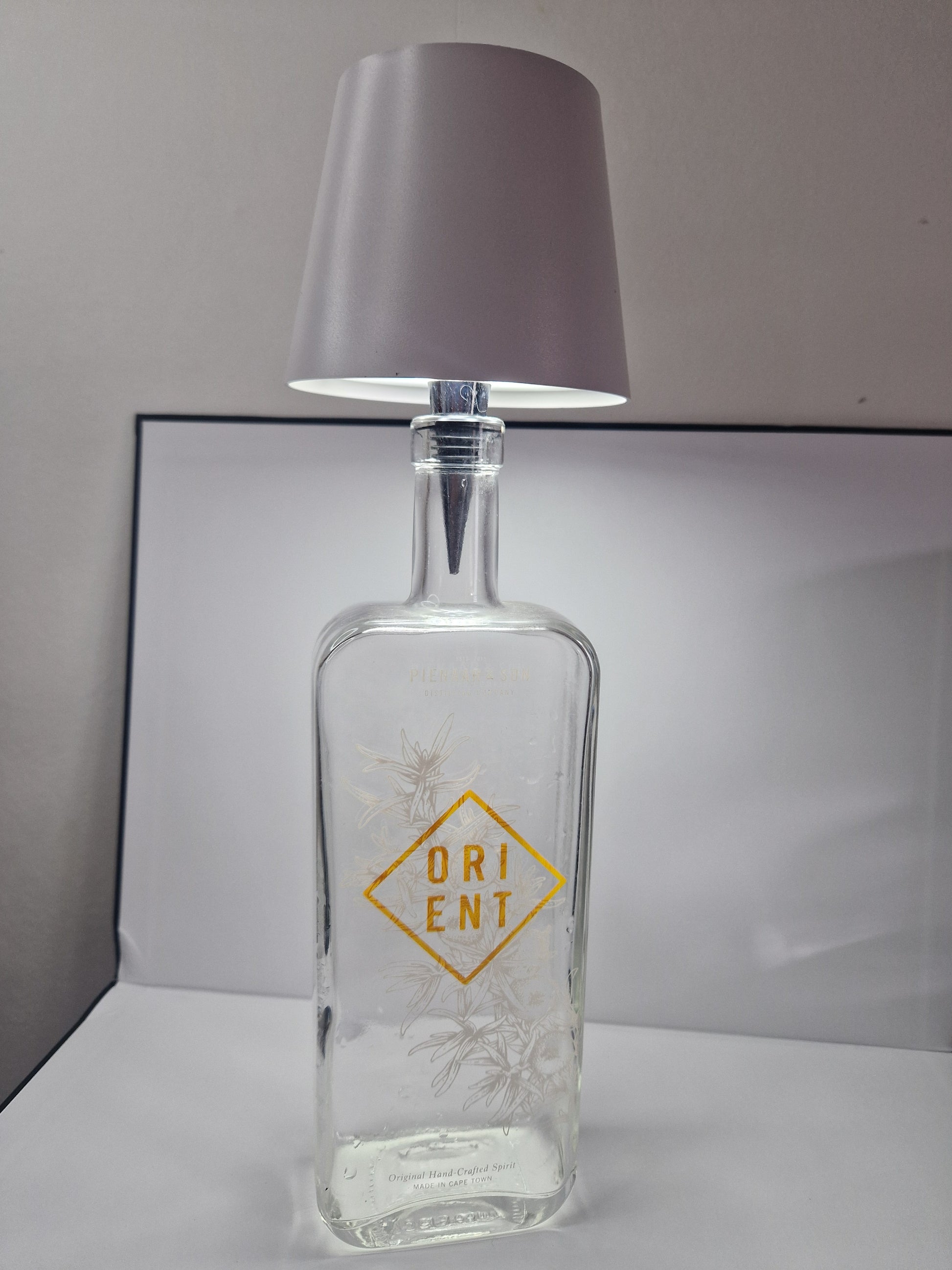 Glass South African gin bottle lamp with white rechargeable lamp shade. Lamp shade can be removed to charge. 2 light settings.