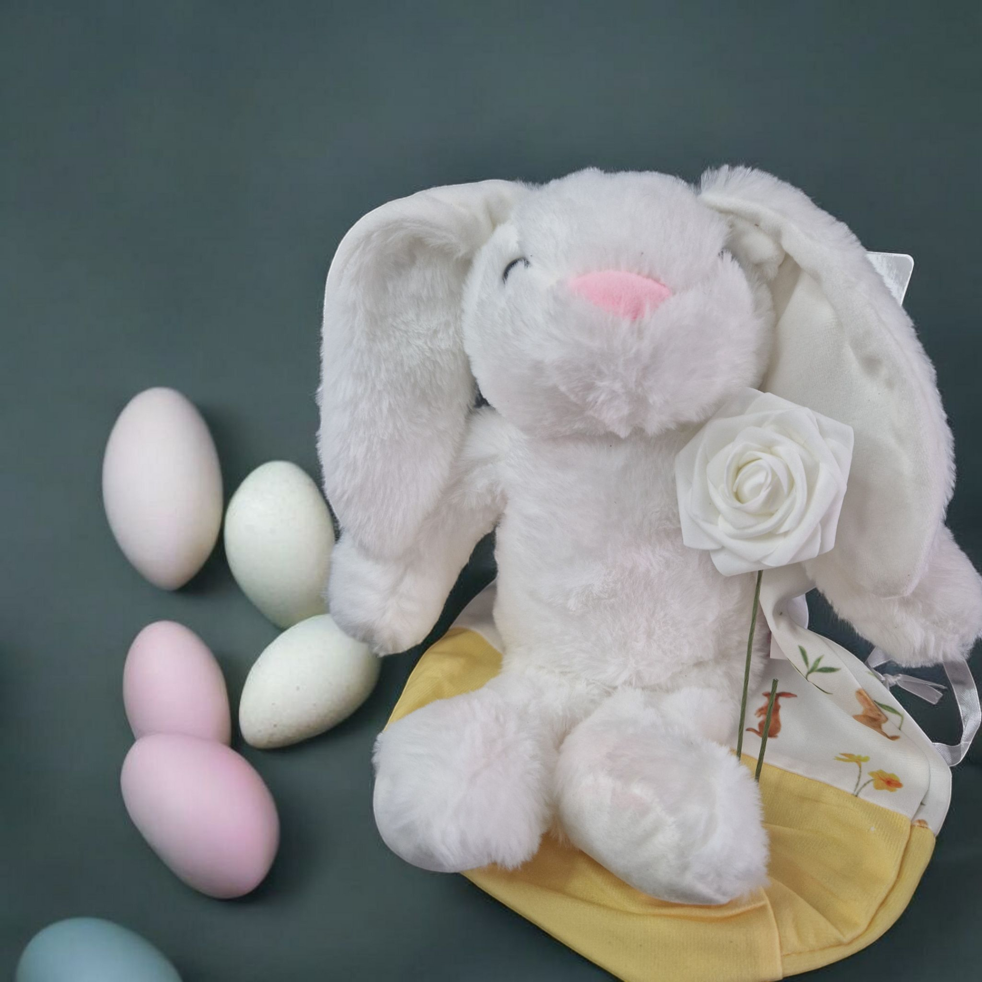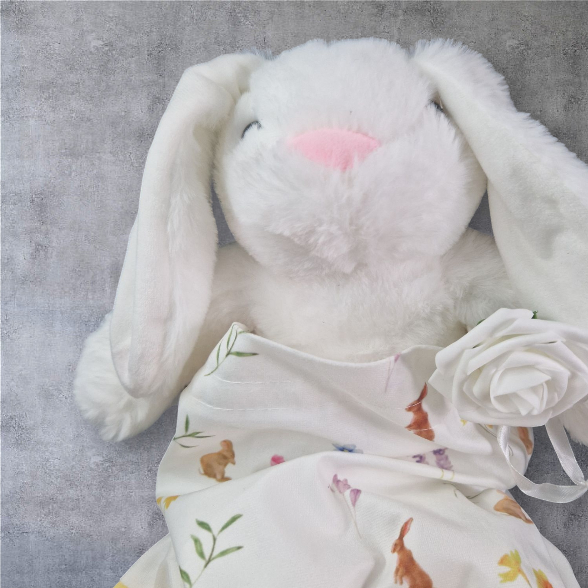 Soft 40cm white bunny in a velvet bunny bag. Bunny will be personalised with name across tummy and name on the bag. Bag comes in yellow, blue or pink. Choose your colour, then add personalisation at checkout